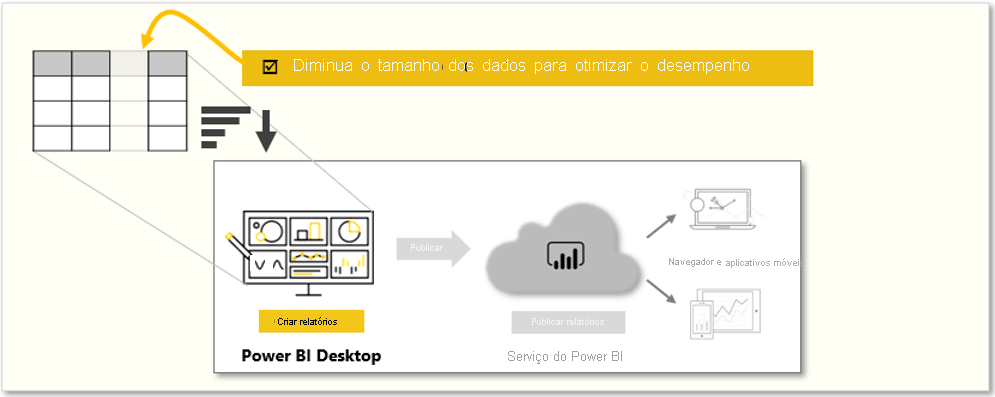 Um modelo semântico de tamanho menor usa menos recursos (memória) e proporciona atualização de dados, cálculos e renderização de visuais mais rápidos nos relatórios. Portanto, o processo de otimização de desempenho envolve minimizar o tamanho do modelo semântico e utilizar os dados do modelo da forma mais eficiente possível. Suas decisões de design devem: