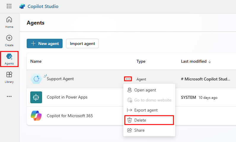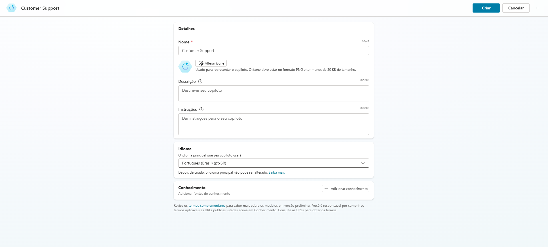 Criar agentes e trabalhar com a interface do Microsoft Copilot Studio