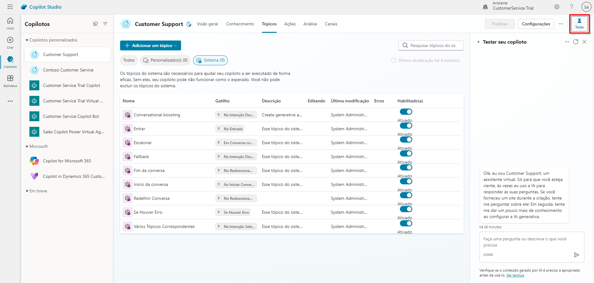 Como um agente é composto de vários tópicos, é importante garantir que cada tópico esteja funcionando corretamente e que as interações com eles possam ocorrer conforme o esperado. Por exemplo, se quiser ter certeza de que o tópico Store Hours será disparado quando alguém inserir um texto perguntando sobre o horário de funcionamento da loja, você poderá testar o agente para garantir que ele responda da maneira apropriada.