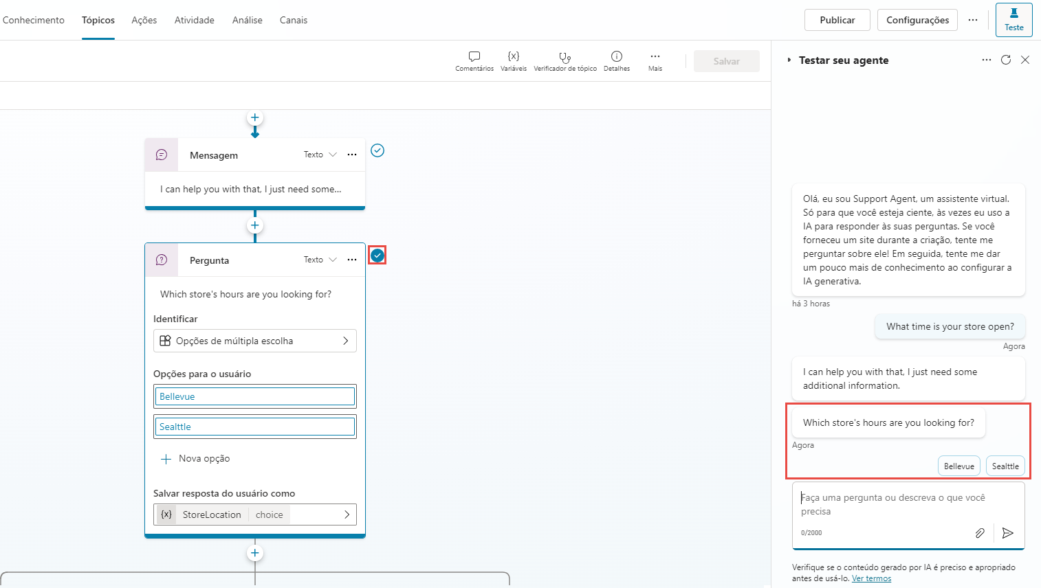 A imagem a seguir mostra a mensagem "A que horas sua loja abre?" foi enviada para o agente. Observe que você é levado automaticamente ao tópico Store Hours. O roteiro da conversa é realçado em vermelho. Agora, o agente está aguardando que você responda e forneceu dois botões de sugestão sobre como responder. Esses botões de sugestão refletem as opções de usuário Seattle e Bellevue que foram definidas quando o tópico foi criado anteriormente. No agente de teste, você pode selecionar um desses botões de sugestão para continuar.