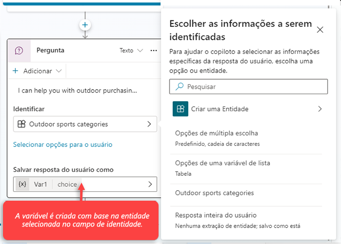 As variáveis são criadas automaticamente quando você adiciona um nó de pergunta a um tópico e podem ser editadas na seção Salvar resposta de usuário como. Por padrão, quando um nó de pergunta for inserido, ele será criado com opções de Múltipla escolha. No entanto, qualquer entidade predefinida ou personalizada pode ser usada, bastando selecioná-la em Identificar.