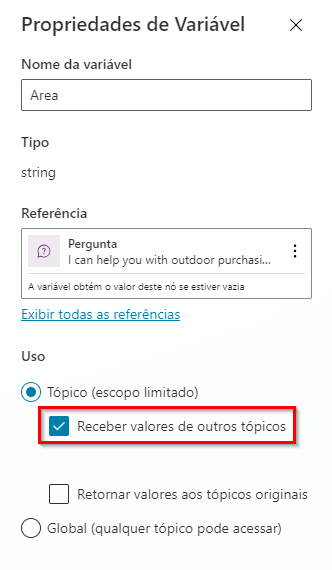 Quando você define uma variável em um tópico (por exemplo, inserindo um nó de pergunta), a resposta do usuário para as perguntas é preenchida para a variável associada a essa pergunta. Como você já tem o valor, não há motivo para fazer a pergunta novamente. Nesses casos, você pode definir a variável para Receber valores de outros tópicos.