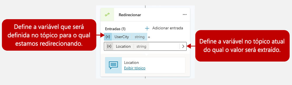 Ao configurar o nó de redirecionamento, você precisará definir a variável que deseja preencher no tópico de destino. Depois de especificar a variável que você deseja definir no tópico de destino, especifique o valor do tópico atual que será usado. Por exemplo, na imagem abaixo, estamos redirecionando para um tópico chamado Localização. A variável UserCity no tópico Localização está sendo definida como uma variável de texto chamada Localização no tópico de redirecionamento.