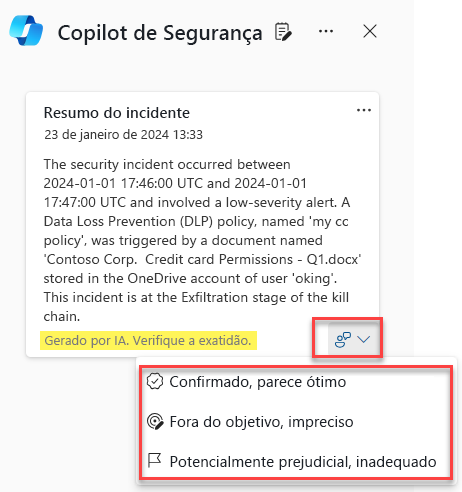 Para qualquer conteúdo gerado por IA, você pode fornecer comentários e precisão do conteúdo. Selecione o prompt de comentários no canto inferior direito da janela de conteúdo e selecione entre as opções disponíveis: confirmado, parece ótimo, fora do destino, impreciso ou potencialmente prejudicial, inadequado.