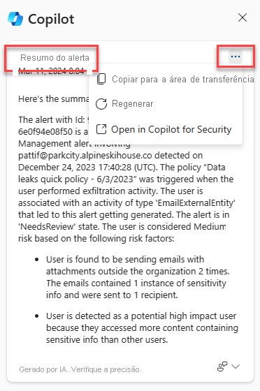 No resumo do alerta, você pode usar as reticências no canto superior direito para copiar a resposta para a área de transferência, regenerar ou fazer a transição para a experiência autônoma selecionando Abrir no Copilot da Segurança.