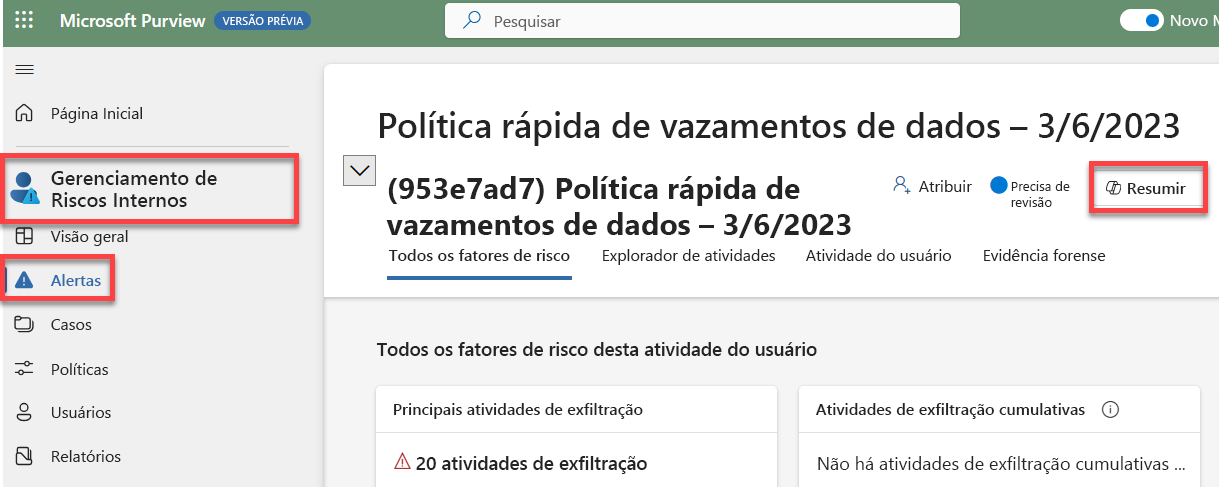 A capacidade de resumir alertas do Gerenciamento de Riscos Internos permite que você obtenha rapidamente os destaques do possível incidente identificando detalhes críticos do usuário, como atividades de exfiltração, padrões, funções de usuário e atividades incomuns que podem levar a possíveis incidentes de segurança.