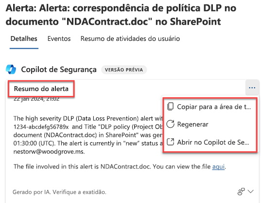 Selecione Resumir para que o Copilot gere o resumo do alerta. No resumo do alerta, você pode usar as reticências no canto superior direito do resumo do alerta para copiar para área de transferência, regenerar ou abrir a resposta na experiência autônoma do Copilot.