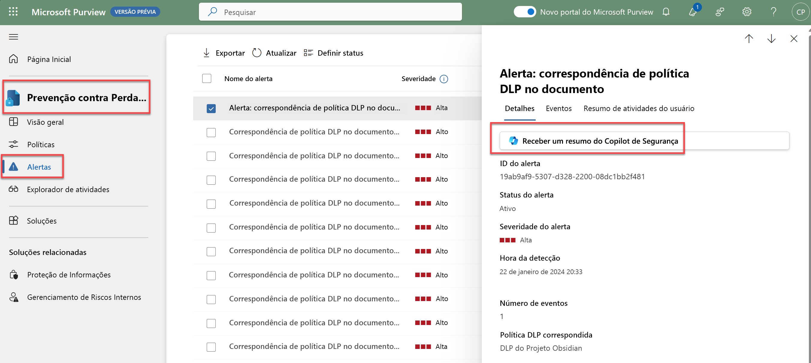 Para resumir alertas de Prevenção contra Perda de Dados usando o Copilot: