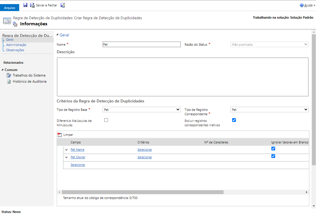 As regras de detecção de duplicidades devem ser publicadas e podem levar algum tempo para serem publicadas, pois os códigos de correspondência são criados em segundo plano para cada linha da tabela.