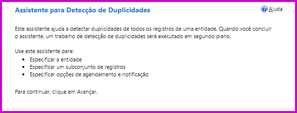 Os trabalhos de detecção de duplicidades são criados usando um assistente.