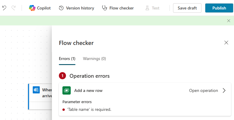 - Erros: Itens que fazem com que o fluxo não opere. Qualquer fluxo que contenha erros não pode ser publicado. Você precisa corrigi-los antes de publicar.