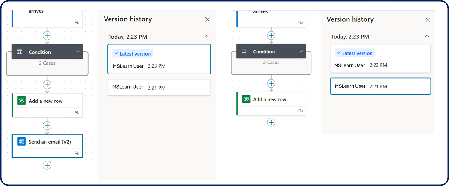 A versão mais recente aparece na parte superior da lista de versões. À medida que você seleciona cada versão, o designer reverte para a versão selecionada. Depois de identificar a versão que deseja usar, você pode salvar o fluxo.