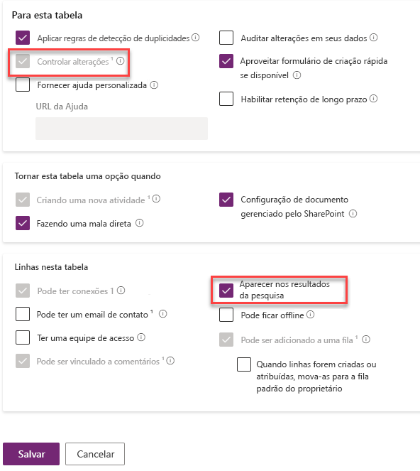 Marque as caixas de seleção Rastrear alterações e Aparecer nos resultados da pesquisa.