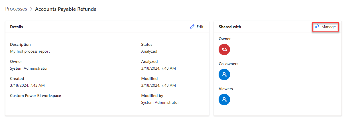 Você pode compartilhar os processos criados com seus colegas. Além disso, você pode especificar se deseja que eles exibam apenas os dados analíticos e de processo ou se deseja conceder permissão para fazer alterações. Você pode compartilhar seus processos com seus colegas como espectadores ou coproprietários, dependendo de suas preferências.