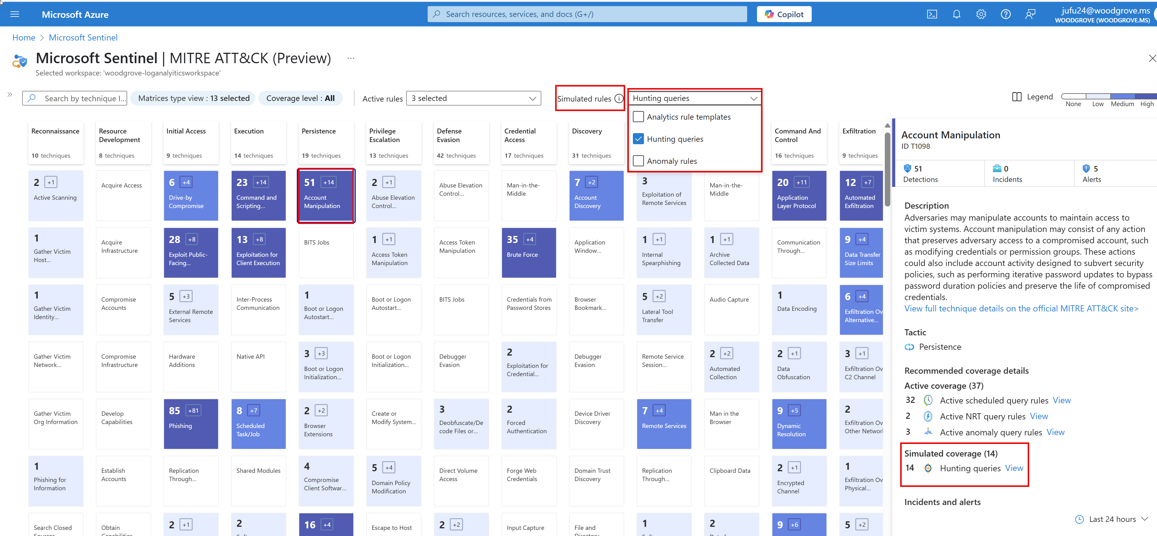 No Microsoft Sentinel, no portal do Defender, selecione a seção Gerenciamento de ameaças do menu de navegação, selecione MITRE ATT&CK. Por padrão, a consulta agendada ativa, as regras NRT (quase em tempo real) ativas e as regras de consulta de anomalias ativas são indicadas na matriz de cobertura.