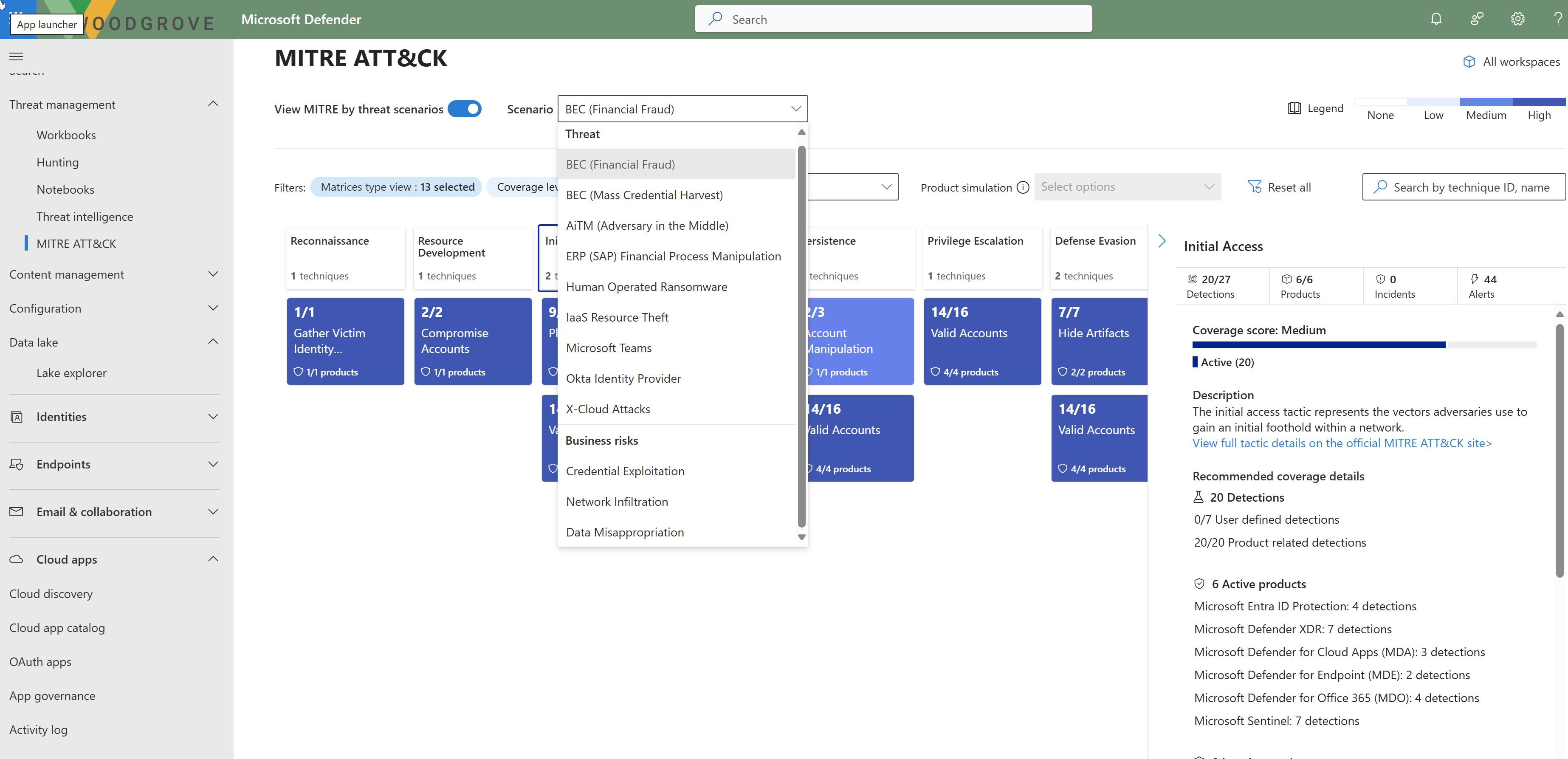 Exiba o MITRE por cenários de ameaça para exibir a matriz de cobertura por cenários de ameaça: