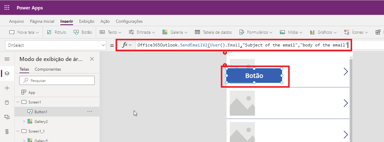Para enviar um email usando o Office 365 Outlook, você pode adicionar um controle de botão ao aplicativo e definir a propriedade OnSelect para isto: