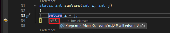 A partir do Visual Studio 2022 versão 17.12, você pode exibir valores retornados de chamadas de método diretamente no código e não apenas na janela Autos.