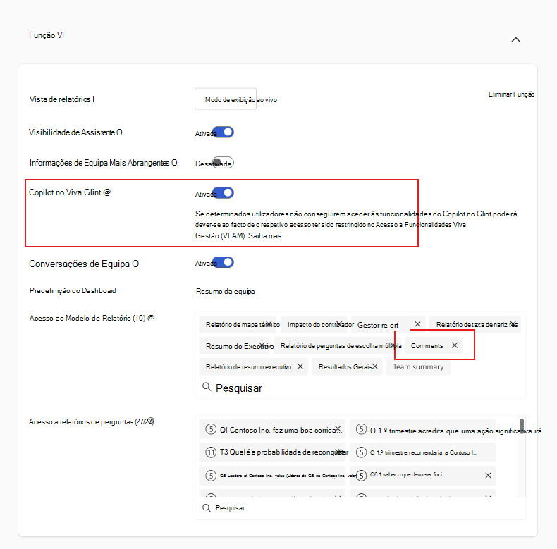 Alterne Copilot no Viva Glint para Ativado e confirme que a função tem Comentários selecionados na secção Acesso ao Modelo de Relatório.
