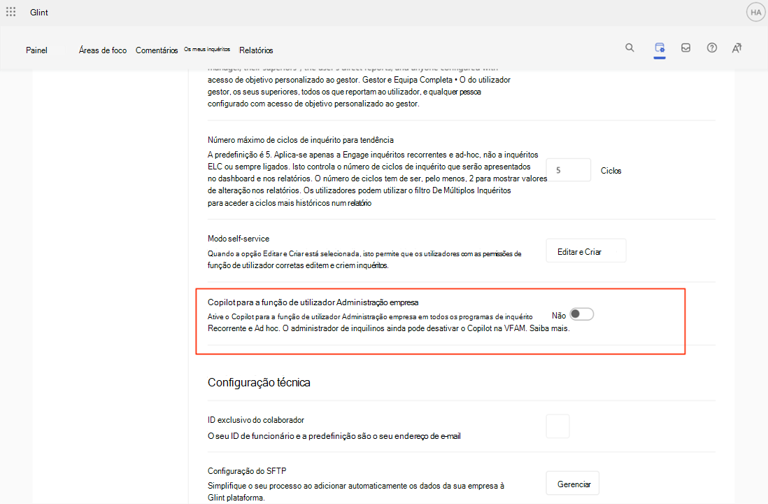 Este botão de alternar está disponível nas Definições Gerais na secção Funcionalidades e está desativado por predefinição. Quando ativada, ativa o Copilot para a função de utilizador Administração empresa em todos os programas de inquérito periódicos e ad hoc elegíveis.