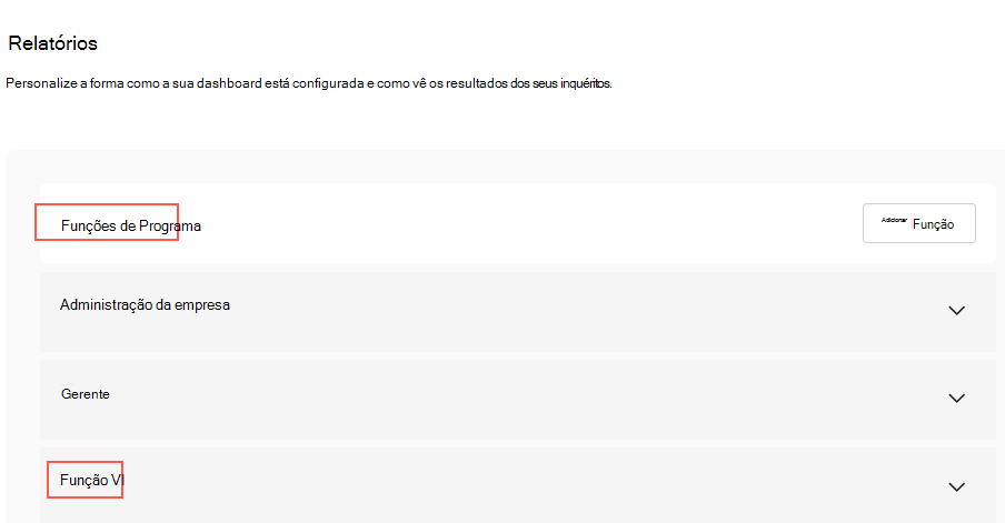 Atribua-se a si próprio e a outros líderes com Copilot no Viva Glint a uma nova Função de Utilizador. A nova Função de Utilizador tem de ter acesso ao Relatório de Comentários. Adicione essa Função de Utilizador à página Relatórios do inquérito no Resumo do Programa.