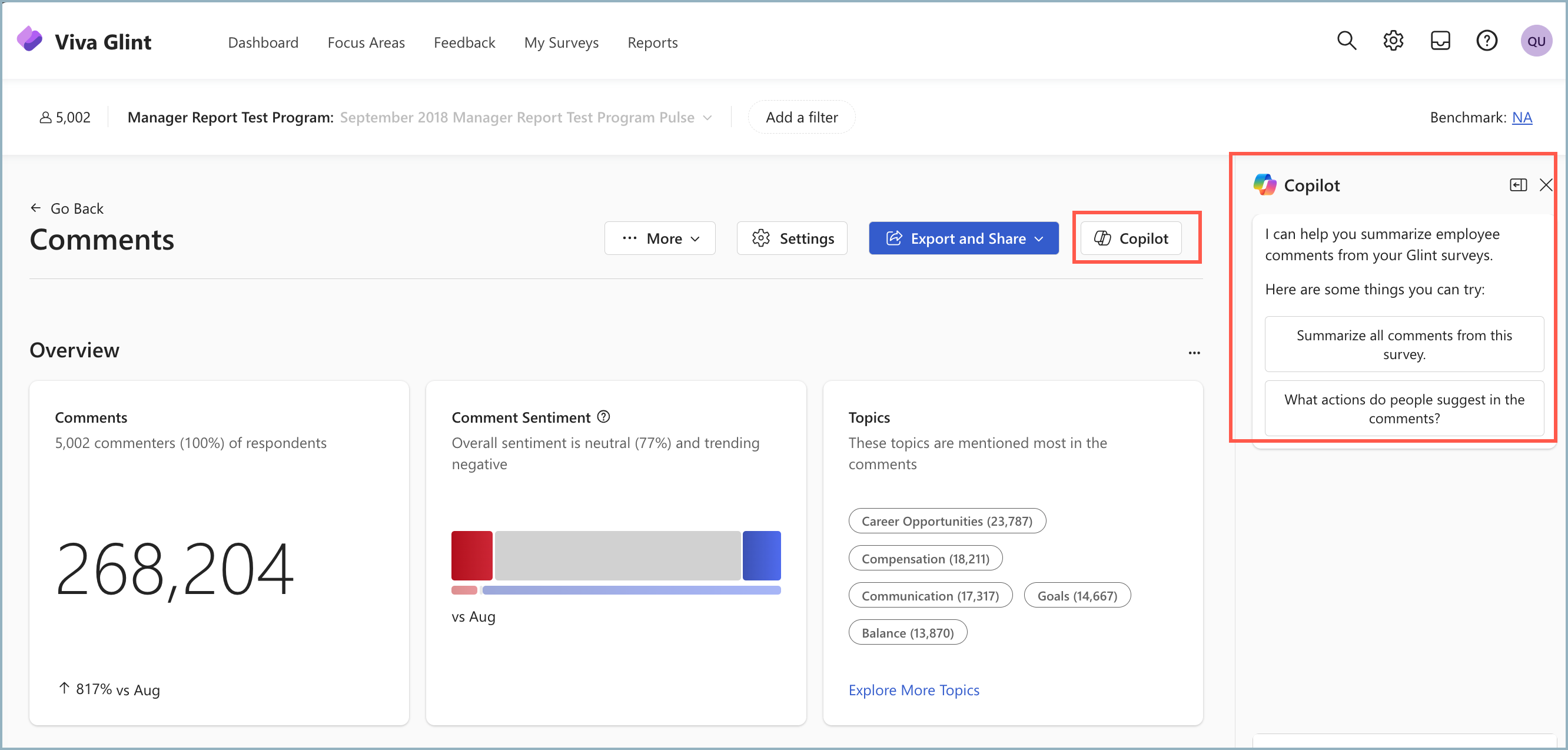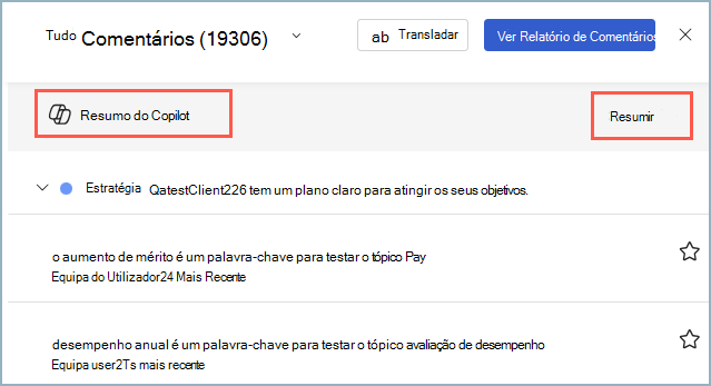 Copilot no Viva Glint pode resumir comentários sobre qualquer relatório em qualquer inquérito Ad hoc ou Periódico.