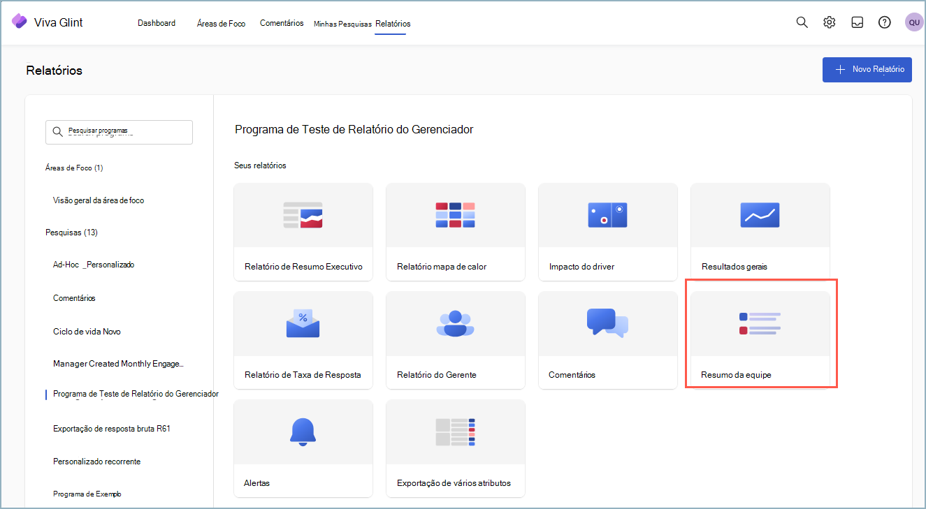 • Navegue para Relatórios na barra de menus superior e utilize Copilot no Viva Glint para um relatório específico.
