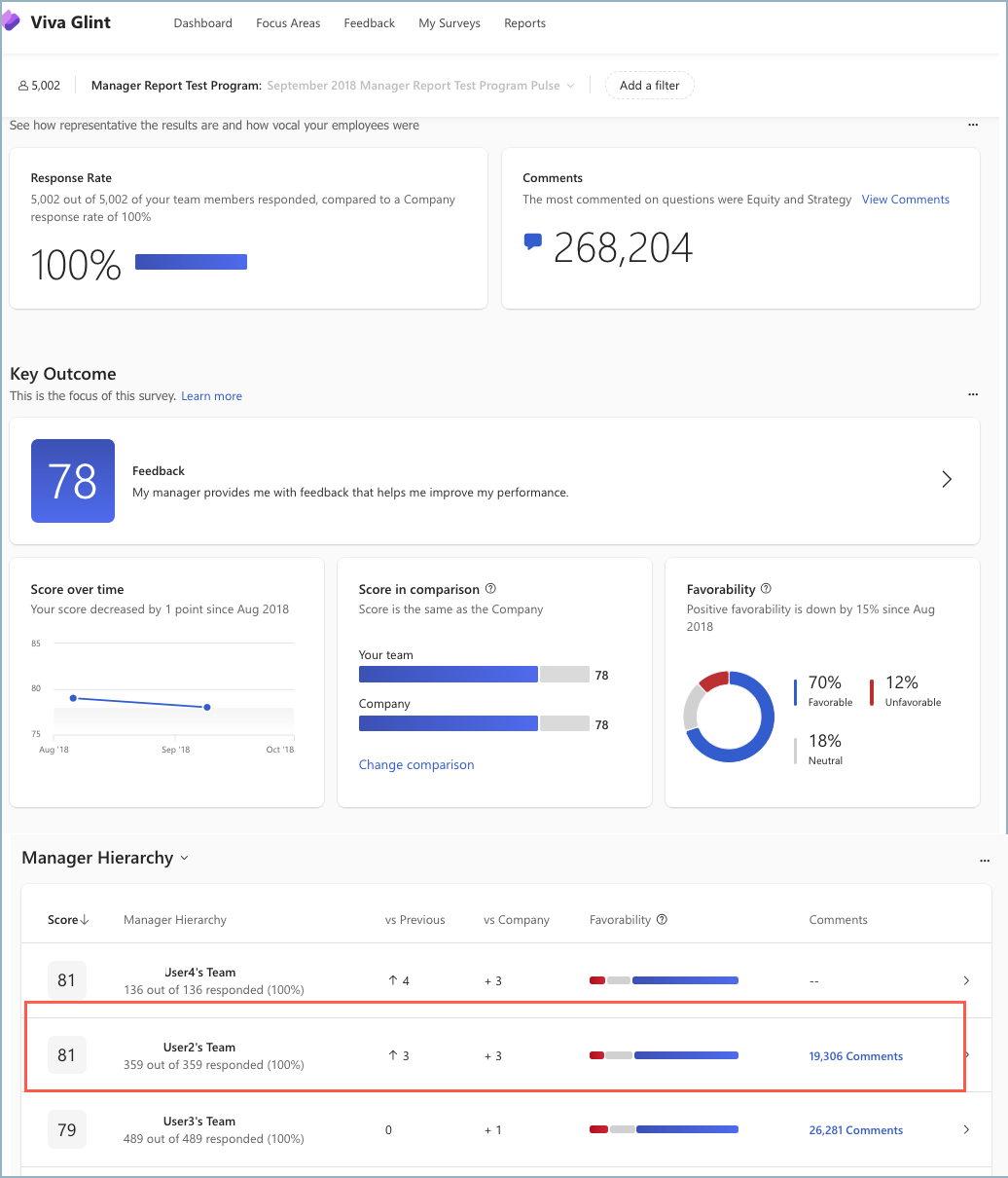 3. Existem várias oportunidades no relatório para ver comentários. Selecione os comentários específicos que pretende ver. Neste exemplo, vamos resumir os 19.306 comentários da equipa do Utilizador 2: