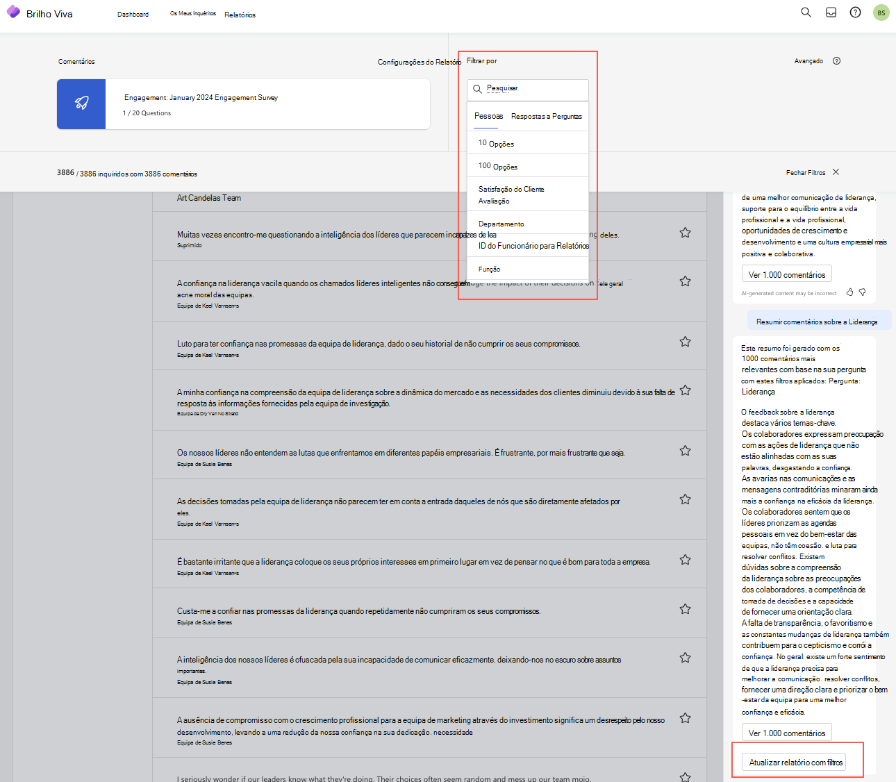 Em relatórios com comentários, pode desagregar os mesmos com Copilot no Viva Glint. Neste caso, Copilot no Viva Glint é incorporada no fluxo de relatórios existente e abre uma nova janela sobre o relatório atual.