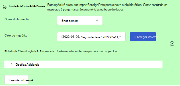 Quando os novos valores de resposta são carregados com êxito, a secção Importação de Classificação Não Processada fica verde.