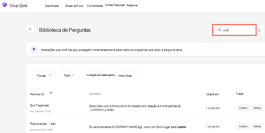 A Biblioteca de Perguntas Microsoft Viva Glint contém centenas de perguntas e instruções (chamadas itens) que podem ser incluídas nos seus inquéritos. Se escolher um modelo para um tipo de inquérito específico, as perguntas e instruções que melhor suportam o objetivo do inquérito são pré-preenchidas no modelo. Pode criar e editar itens a partir da Biblioteca de Perguntas, mas Viva Glint sugere utilizar as nossas perguntas padrão, uma vez que a maioria está mapeada para referências.