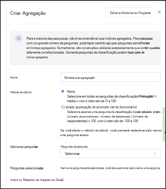 Os agregados são grupos de itens semelhantes. Para inquéritos com um grande número de itens, pode fazer sentido agrupar perguntas semelhantes em agregados. Apenas as perguntas de tipo de classificação podem fazer parte dos índices agregados.