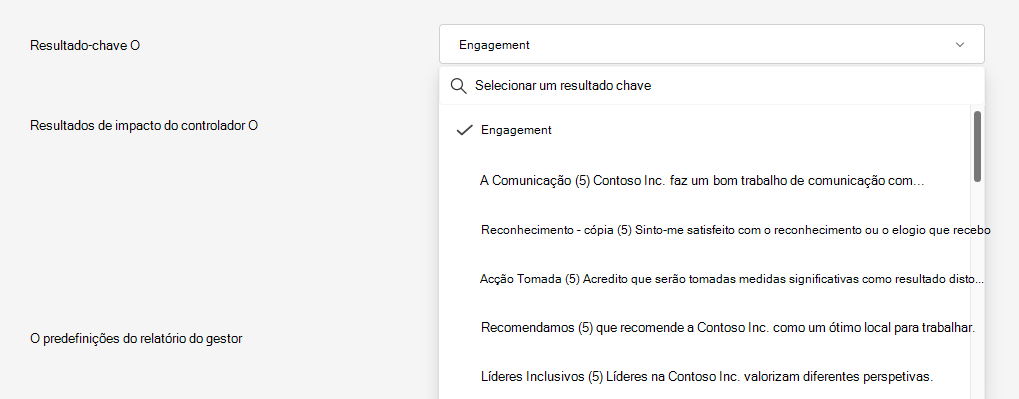 Selecione o Resultado da Chave pretendido no menu pendente. O resultado fundamental é o resultado main do inquérito. Pode ser a classificação de um único item ou de um índice agregado. Esta classificação aparece como a pontuação mais proeminente apresentada na maioria dos relatórios.