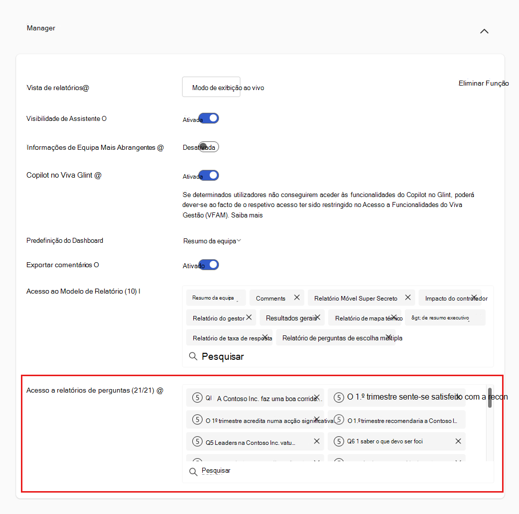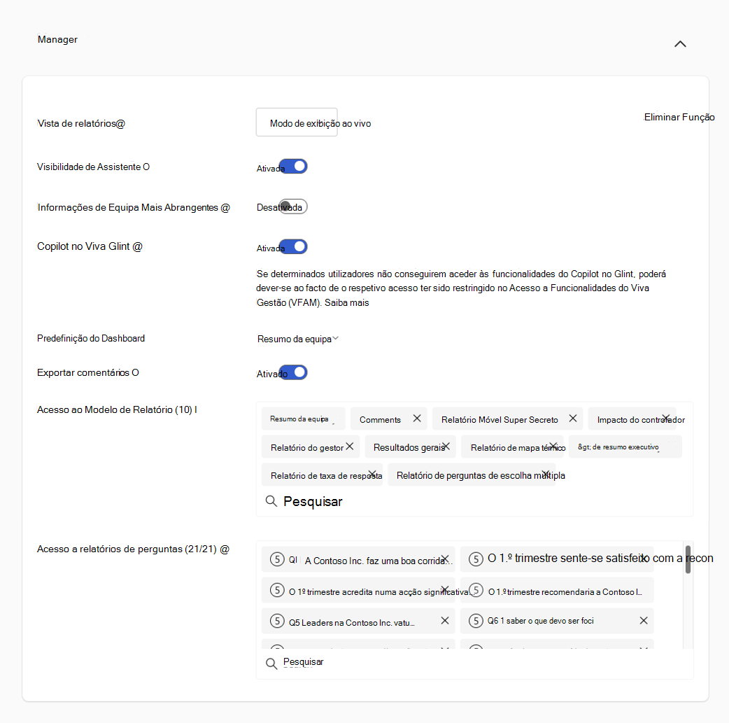 | Acesso ao Modelo de Relatório | O indivíduo comunica que esta função pode ver. Selecione o X para eliminar um relatório ou utilize a opção Procurar para adicionar um relatório. Saiba mais sobre Viva Glint relatórios. |