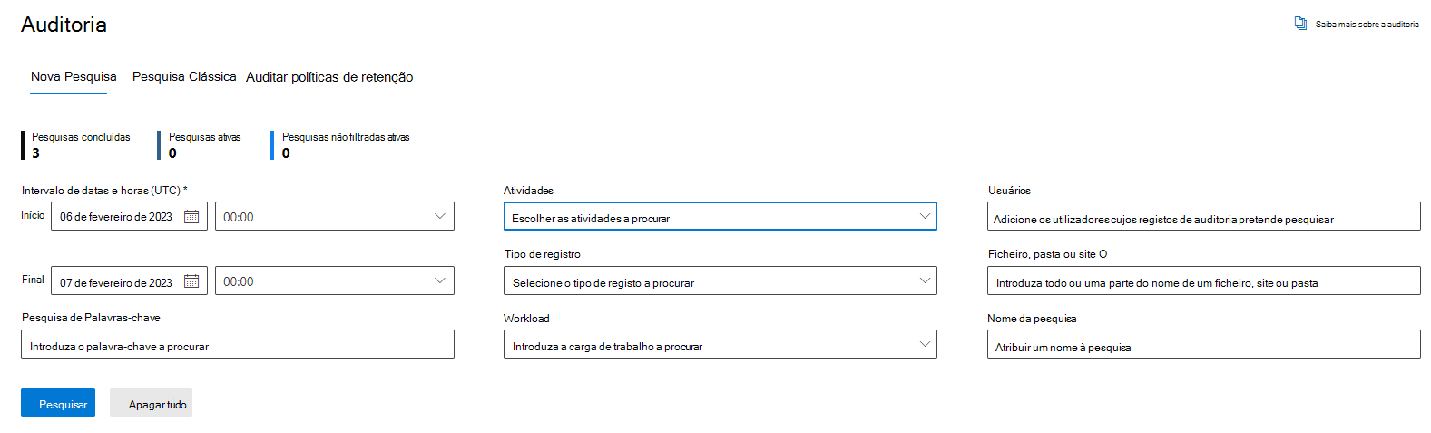 Para monitorizar dados organizacionais relacionados com segurança e conformidade em eventos do Microsoft 365 para a sua organização, ative o registo de auditoria. Os registos de auditoria estão disponíveis no portal do Microsoft Purview ou através da API de Atividade de Gestão do Microsoft 365. Saiba mais.