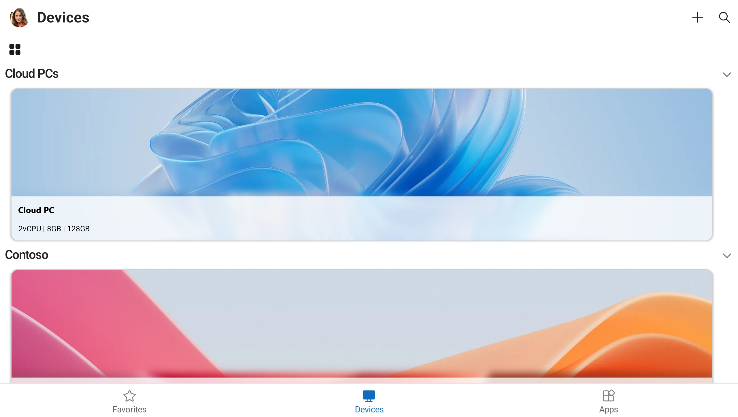 Depois de entrar, a guia Dispositivos mostra seu PC na nuvem e todos os outros serviços aos quais você tem acesso. Se você não vir um PC na Nuvem, entre em contato com o administrador.
