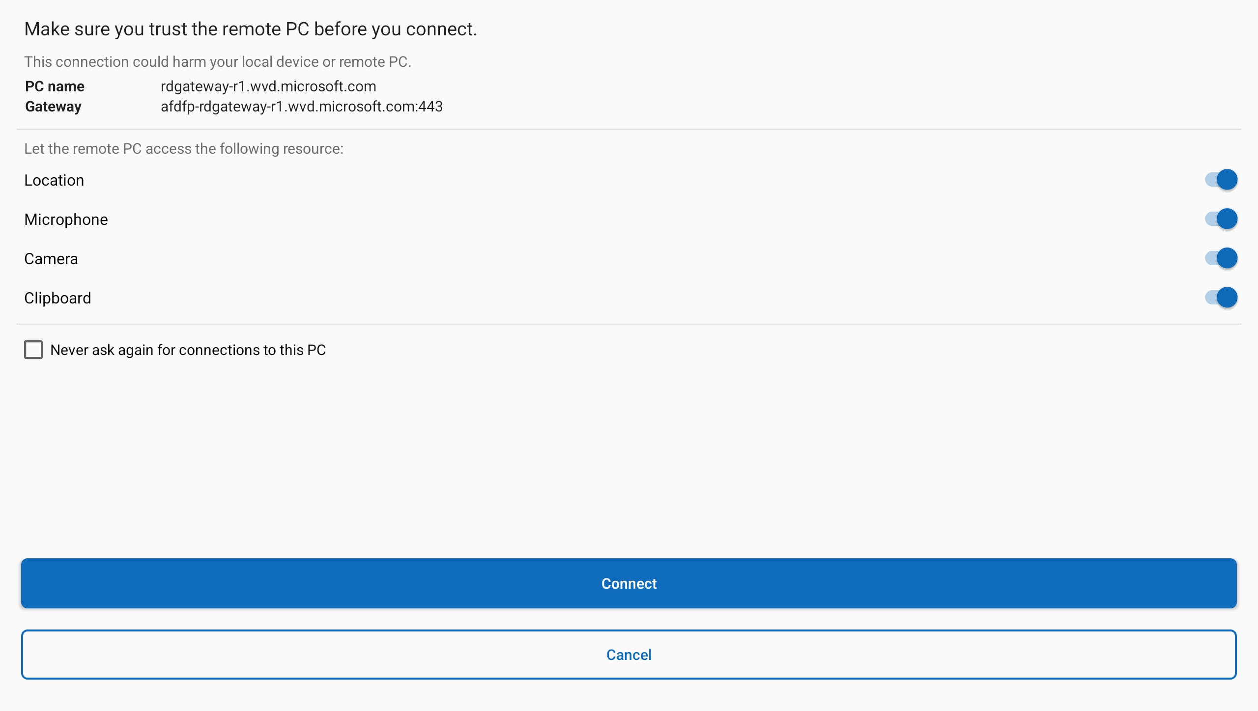 Toque no PC em Nuvem para conectar. Antes que a conexão seja feita, você será solicitado a confiar no computador remoto antes de se conectar. Alterne as opções para permitir que o pc na nuvem acesse os diferentes recursos locais em seu dispositivo e, para impedir que esse prompt seja exibido no futuro, marque a caixa Nunca mais solicitar conexões com esse computador e toque em Conectar.
