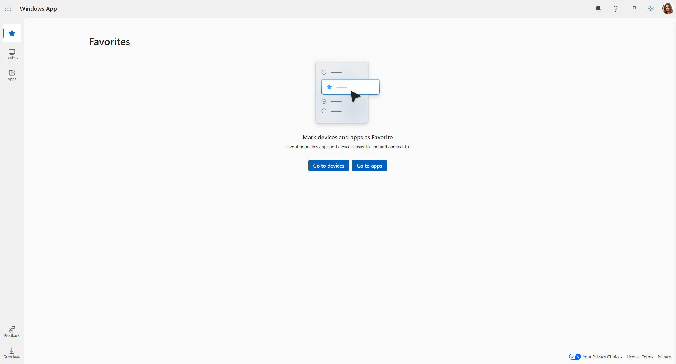 Selecione a guia Dispositivos ou Aplicativos para mostrar seus recursos remotos da Área de Trabalho Virtual do Azure e quaisquer outros serviços aos quais você tenha acesso. As abas ficam ocultas se você não tiver esse tipo de recurso atribuído. Se você não vir nenhum dispositivo ou aplicativo, entre em contato com o administrador.