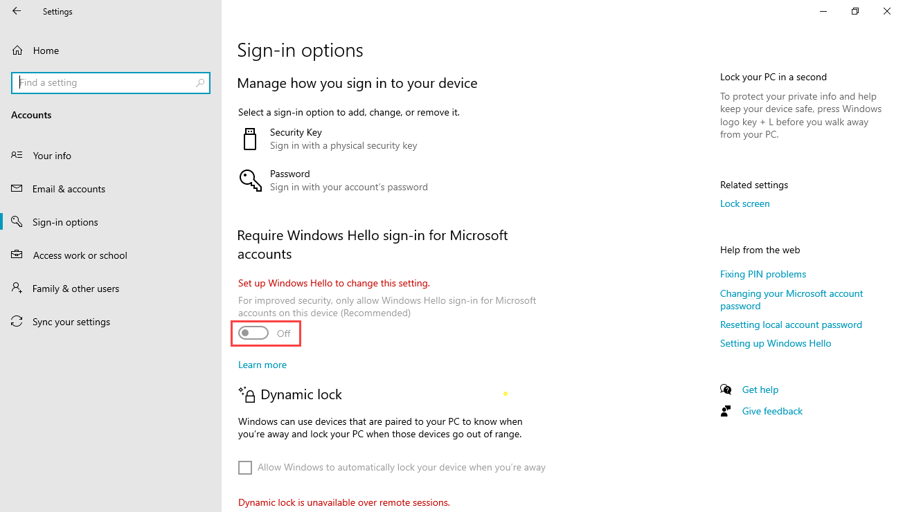 Desativar para maior segurança, permita apenas a entrada do Windows Hello para contas da Microsoft neste dispositivo.