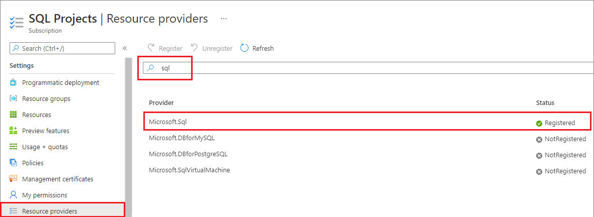 Selecione Registrar, Registrar novamente ou Cancelar registro para o provedor Microsoft.Sql , dependendo da ação desejada.