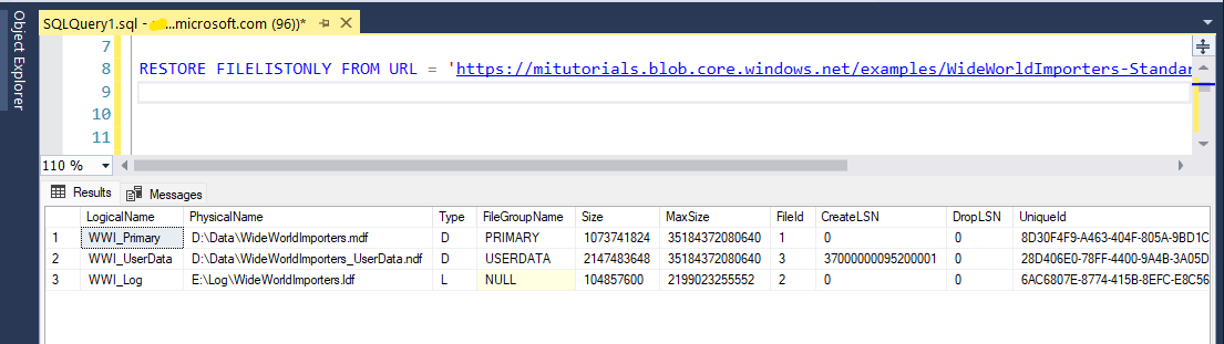 RESTORE FILELISTONLY FROM URL = 'https://mitutorials.blob.core.windows.net/examples/WideWorldImporters-Standard.bak';Execute a instrução a seguir para restaurar o banco de dados Wide World Importers de exemplo.