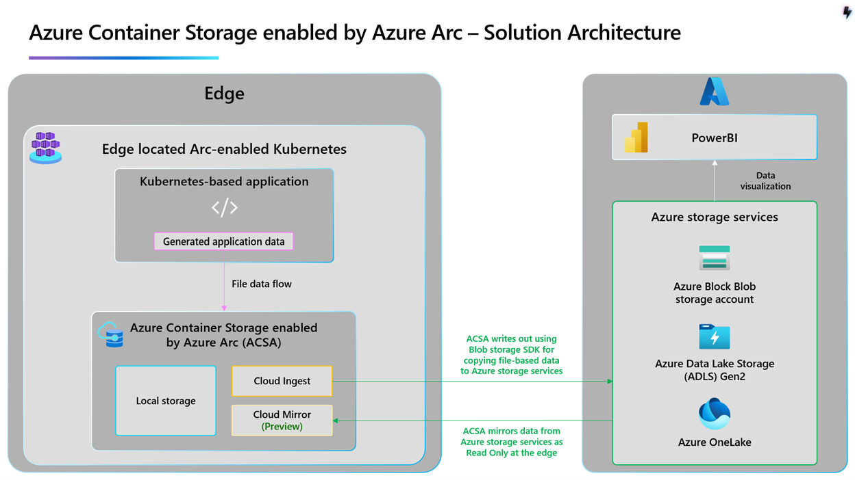 O Azure Container Storage serve como um sistema nativo de armazenamento para clusters Kubernetes ligados a Arc. A sua principal função é fornecer um sistema de ficheiros flexível que permita que os dados sejam mantidos em segurança na periferia, que sejam escalonados para o Azure ou replicados a partir da cloud e disponibilizados localmente.