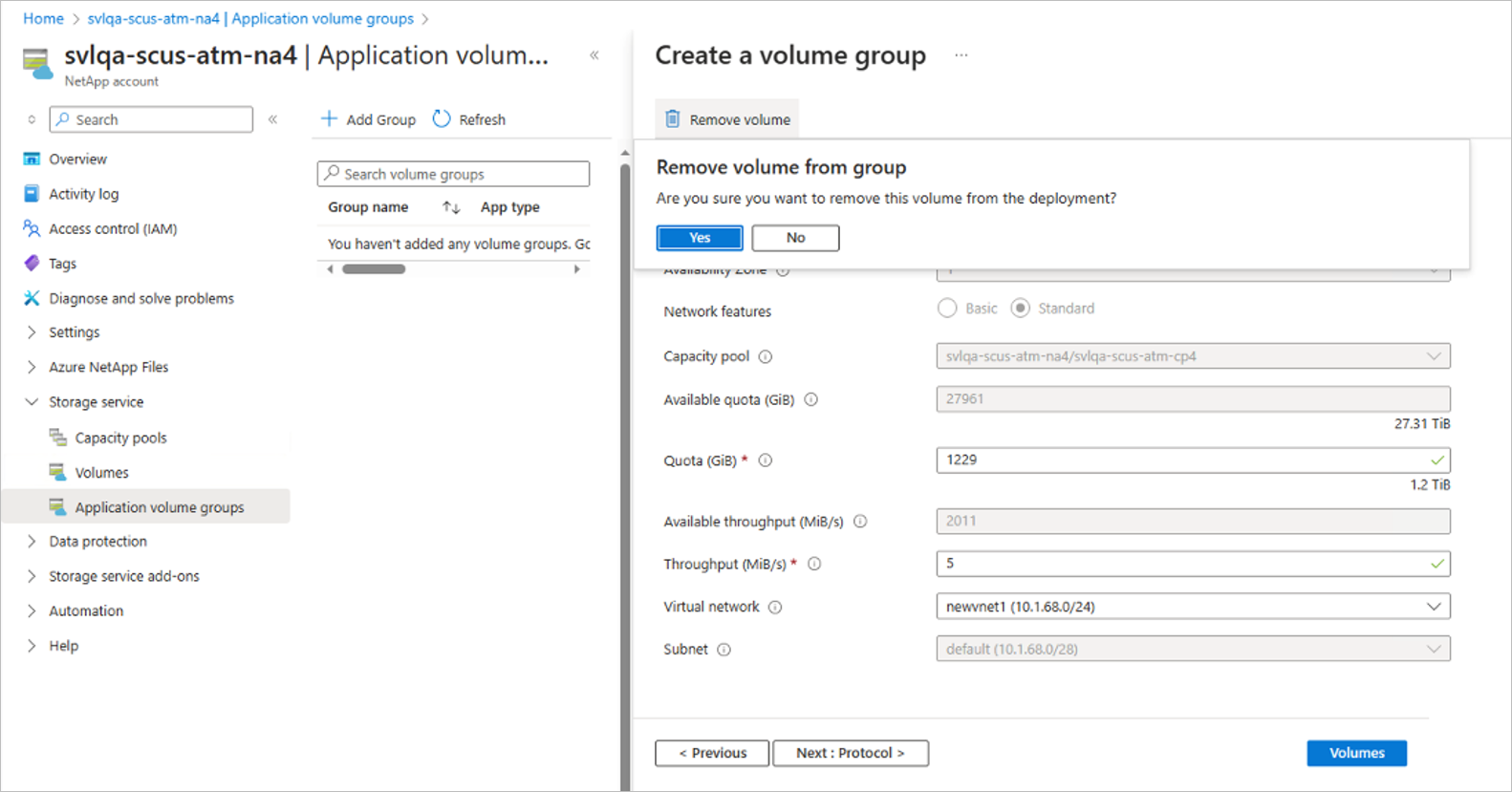 Se quiser remover os volumes opcionais, comoORA1-ora-data4volume ouORA1-ora-binaryvolume, do grupo de volumes, selecione o volume e, em seguida, Remover volume. Confirme a remoção na caixa de diálogo que aparece.Importante