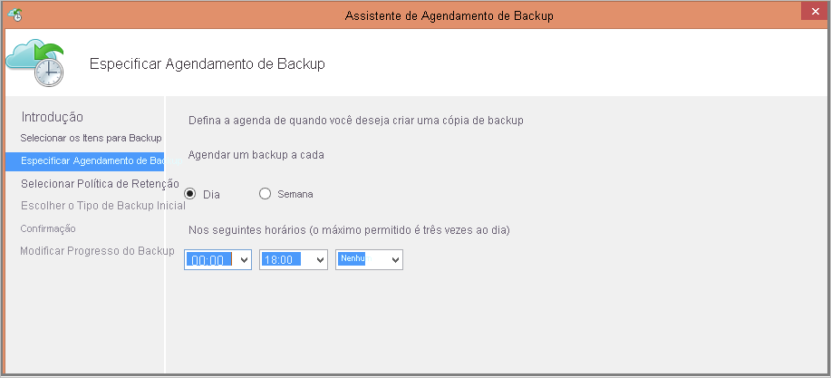 Na página Especificar Agendamento de Backup , especifique quando fazer backups diários ou semanais. Em seguida, selecione Seguinte.