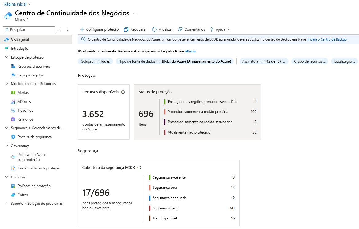Podes aceder à instância de backup a partir da conta de armazenamento através de Conta de Armazenamento>Proteção de Dados>, ou diretamente da Resiliência através de Itens Protegidos>, e depois seleciona Azure Backup como Solução nos filtros.