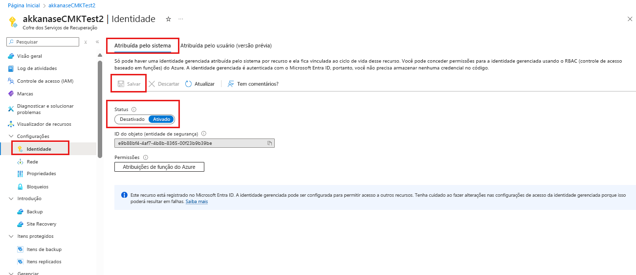 - Habilitada a identidade gerida atribuída pelo sistema do cofre dos Serviços de Recuperação ou atribuída uma identidade gerida pelo utilizador ao cofre.