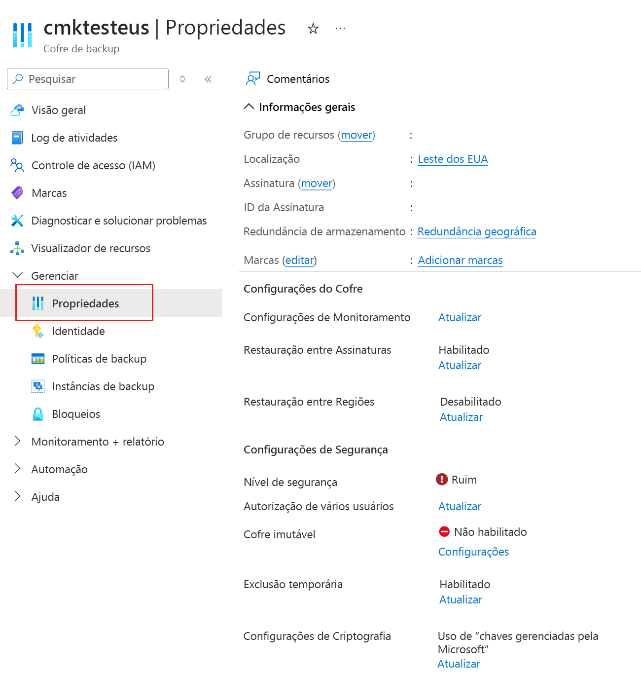 Habilitar a criptografia na criação do vault usando CMKs está em visualização pública limitada e requer a permissão de listagem de assinaturas. Para se inscrever na pré-visualização, preencha o formulário e escreva-nos para AskAzureBackupTeam@microsoft.com.