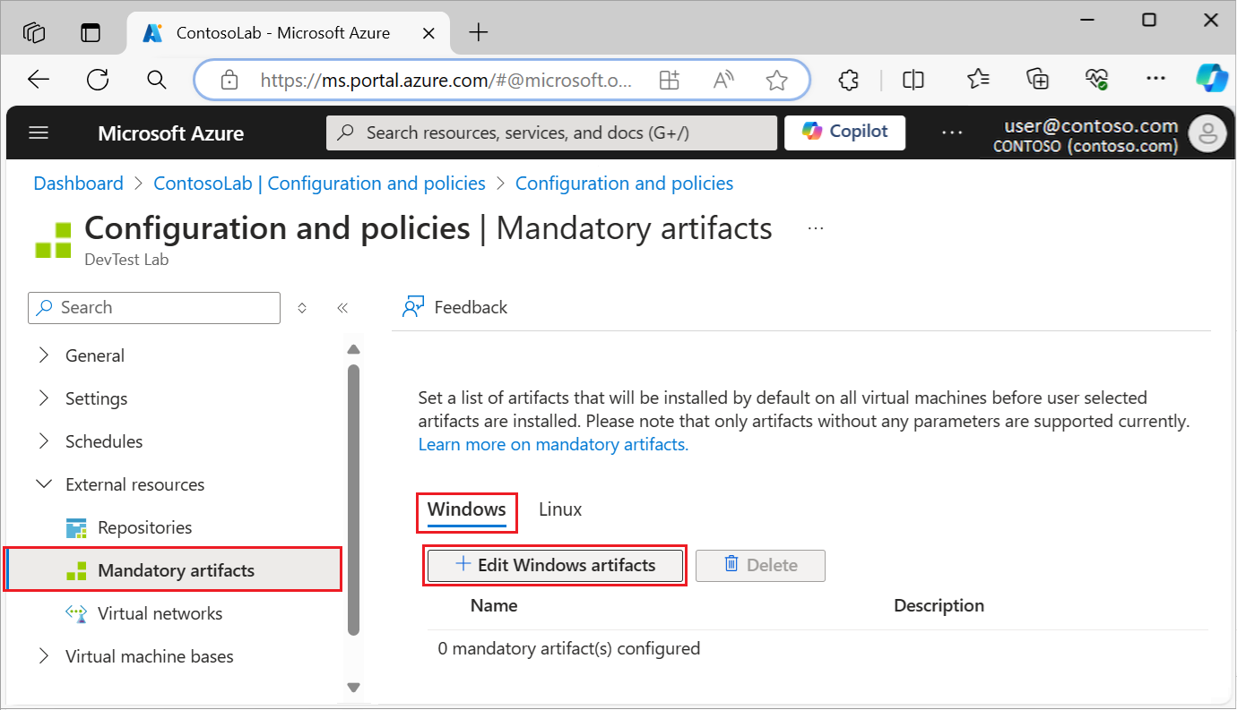 No portal do Azure, vá para o recurso de laboratório do DevTest Labs onde você deseja definir os artefatos obrigatórios.