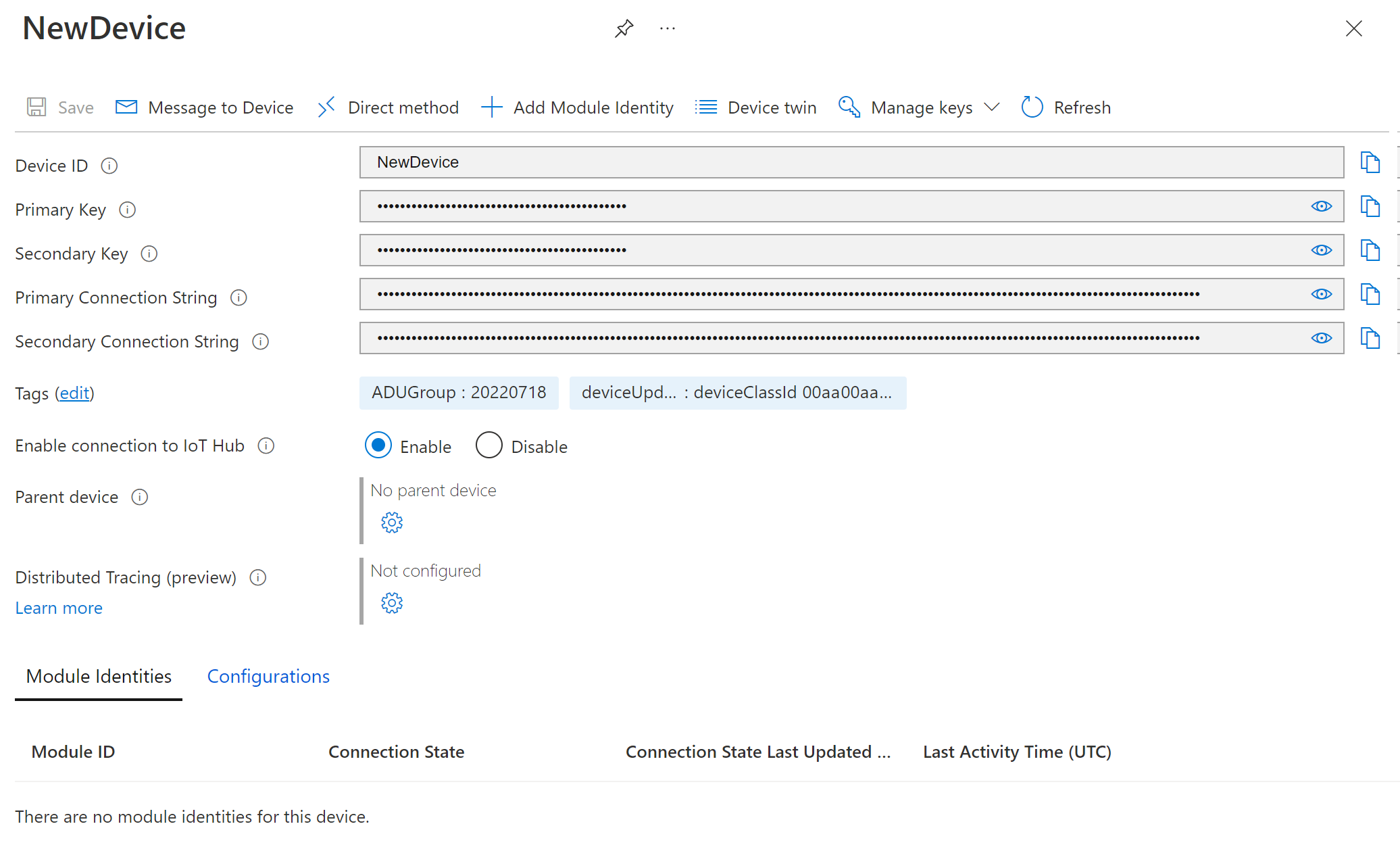 ADUGroupetiqueta e pertencer a apenas um grupo de Atualização de Dispositivo de cada vez. Adicionar outra tag chamadaADUGroupsubstitui o valor existenteADUGroup. - Você pode usar qualquer valor para a tag , exceto os valores