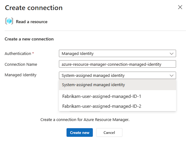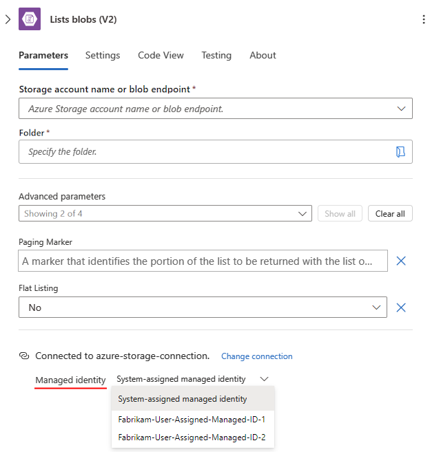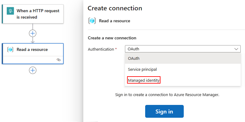 Podes usar uma identidade gerida ao nível do recurso da aplicação lógica e ao nível da ligação.